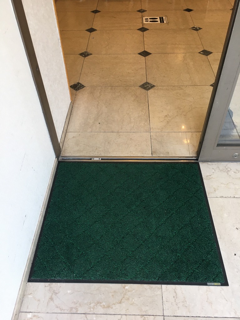 館内でのウイルスの飛散を避けるためロビー入口に除菌マットを